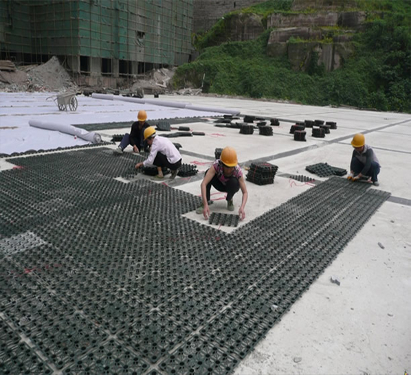 5. 蓄排水板铺设完毕后,可进行下一道工序,尽快铺设好过滤土工布和基质层,防止泥土、水泥、黄砂堵塞孔道或进入蓄排水板的蓄水、水槽、排水通道。为确保蓄排水板充分发挥其作用同时可在过滤土工布上面铺上操作板,方便进行绿化施工。